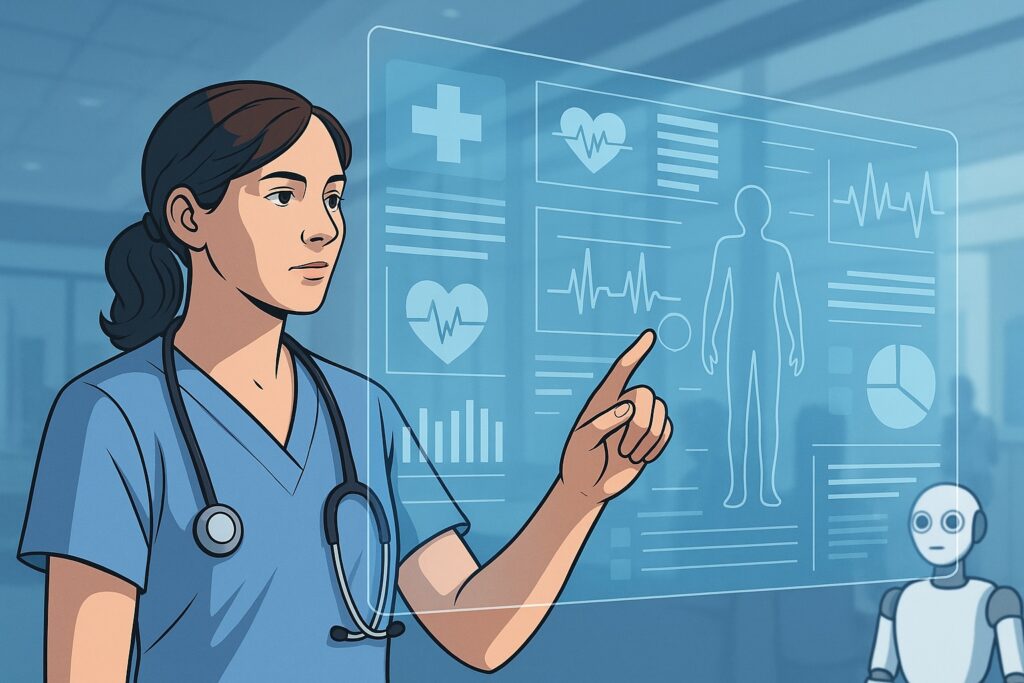 Figure 1. AI-generated image by Rupi Sandhu illustrating the nurse-technology interface in modern practice (Sandhu, 2025).